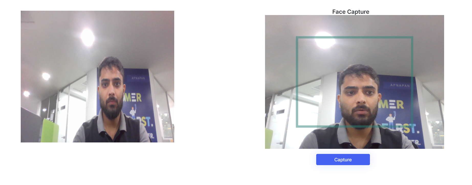 Liveliness detection: For liveliness detection, short 10-second video clips are recorded at regular intervals and sent to the backend for processing. Multiple frames are extracted from each video at different timeframe to compare and analyse eye coordinates and other facial features. By tracking eye blinks and changes in facial expressions, the system determines whether the individual is real.